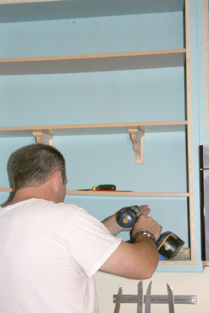 Here's my hard working man putting these cool corbels up to support the shelves because they no longer have the middle support plus don't they look so much cooler? The corbels and the shelves are also going to get primed too. But I thought you might want an update. All of our plates and glasses are all over the counters right now so don't mind the mess.