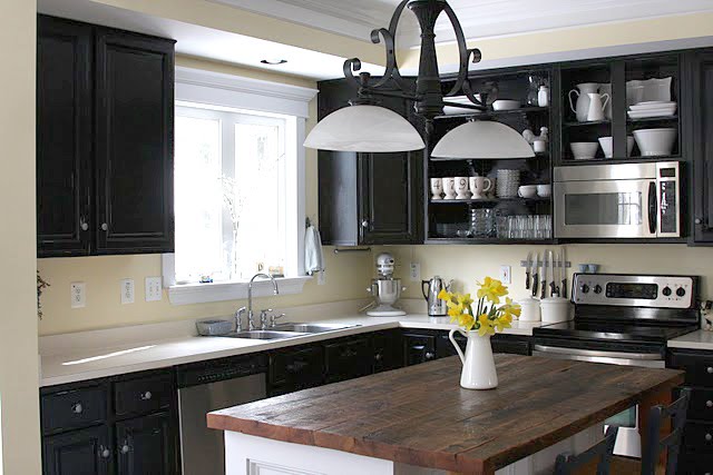 I am one of those people who found your blog after googling painted black cabinets. Funny. I am thinking of doing this. What I was going to do is pray paint the doors black, use regular paint on the cabinets, and then use a mushroom colored glaze over the black. But then I want color on my walls, so maybe I will do like you did and paint the wood a coordinating color to the wall color. You have given me lots to think about. THANKS!! for posting this.