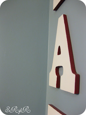 I got busy painting them, I used the same color as my cabinets and then trimed the edge in red. The red trim idea was from my wonderful husband. I was originally going to paint the whole letters red, but it was a little too much, but then the cream seemed a little boring, so in came hubby with his great idea to save the day.