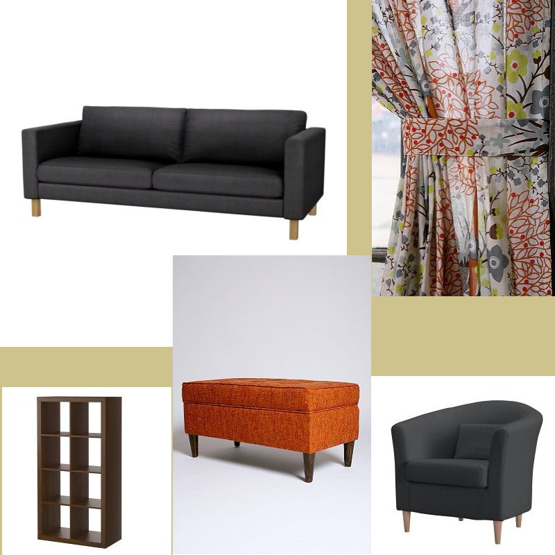 I fell in love with the curtains first. Before we owned a house, before we were finished hunting, I was thinking about those curtains. At this point, the living room is furthest along because I've pictured it in my mind for quite some time. It took some prodding to get Dan on board with the wall color (Valspar's Olive Marinade), which he still claims is not the same as the mood board I used to sway him :), but finding the rest came pretty easy.