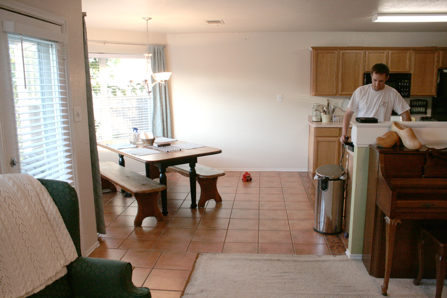 All rooms are off white, with off white carpet or vinyl. The previous owners did have the decency to paint our nearly non-existent (it is SO small-technically it is door casing) baseboards and trim white - so there is a shred of contrast. The kitchen is an orange nightmare, from orangy faux Saltillo ceramic tiles, to our orange oak cabinets to the peachy-pink-orange Formica counter tops. And all the rest is the cheapest builder grade option they could find.