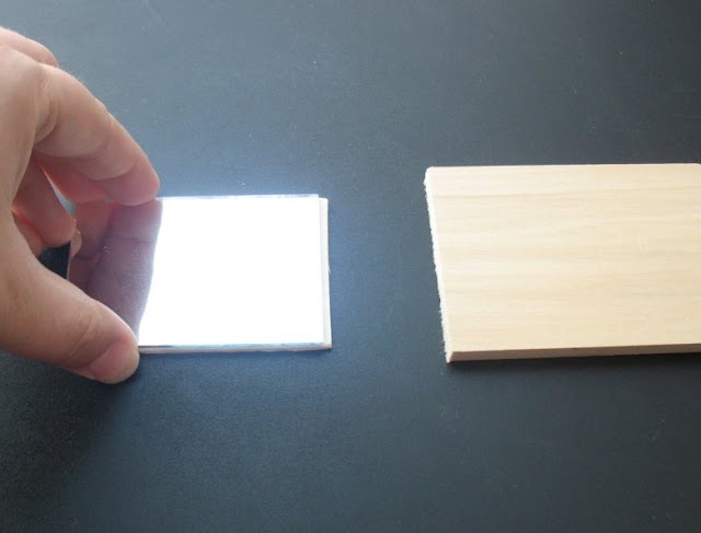 I wanted to give the mirrors a beveled look and needed to add some depth to them. I did this by glueing the mirrors to the two different pieces of wood: first one is a wood tag and the second is a thicker one.